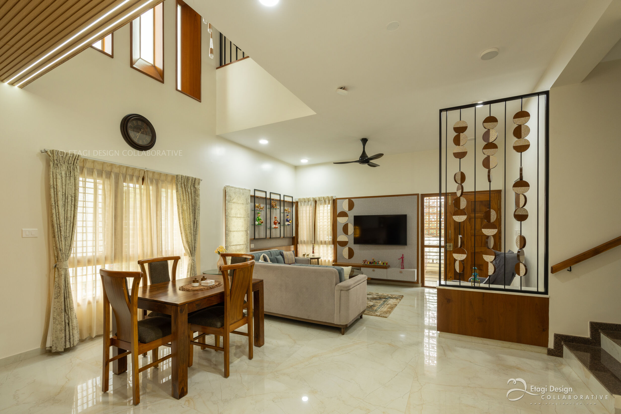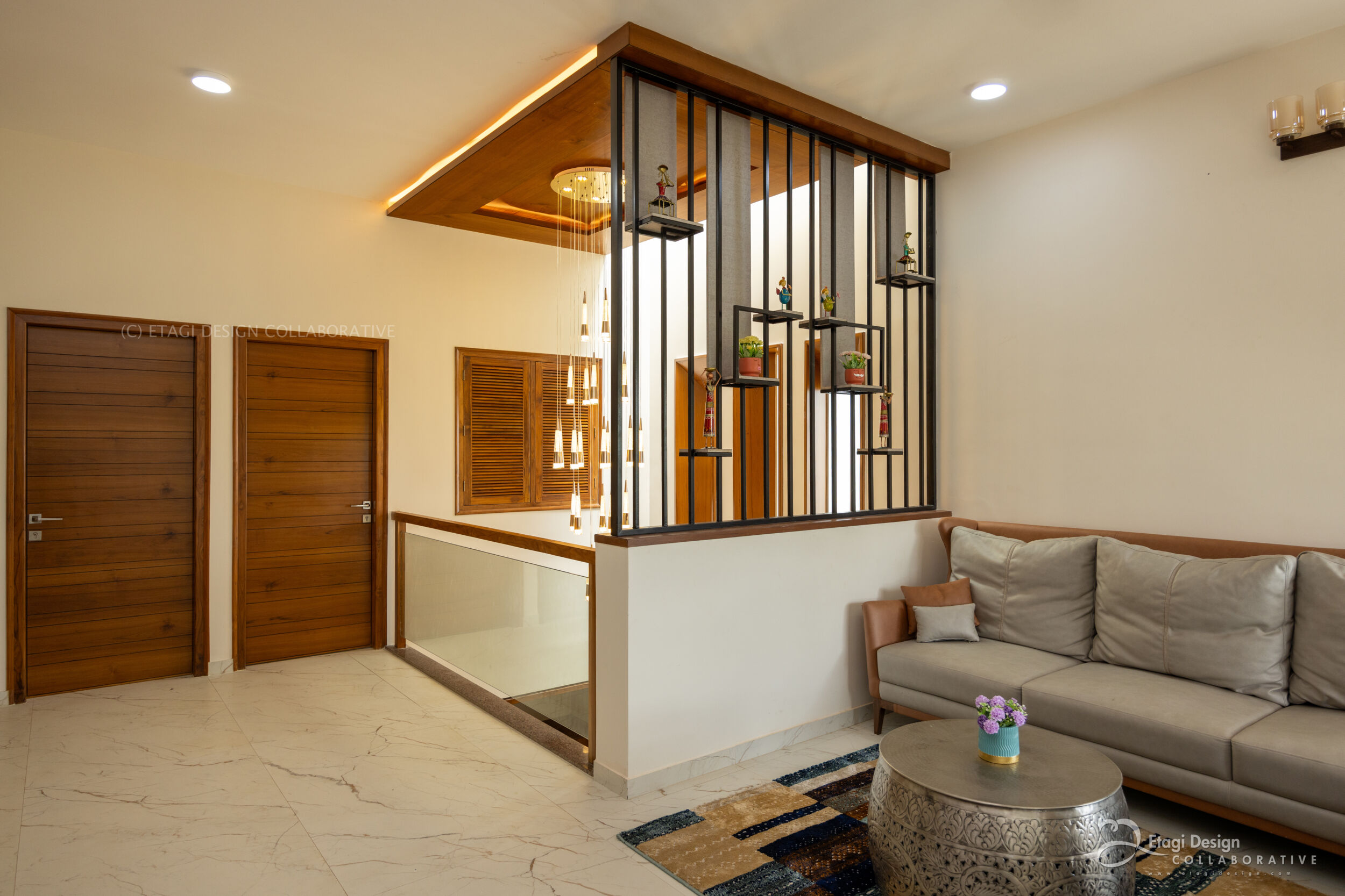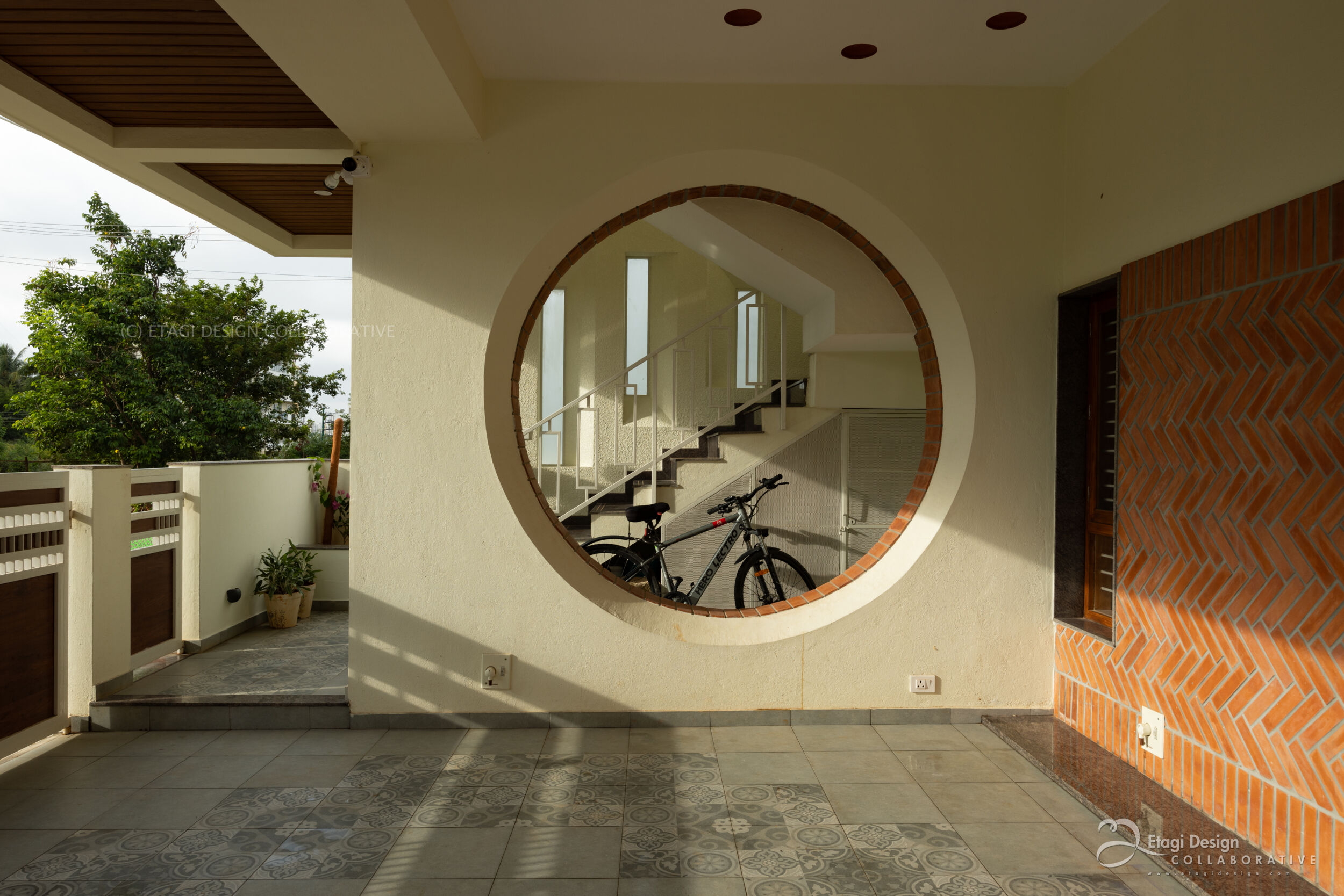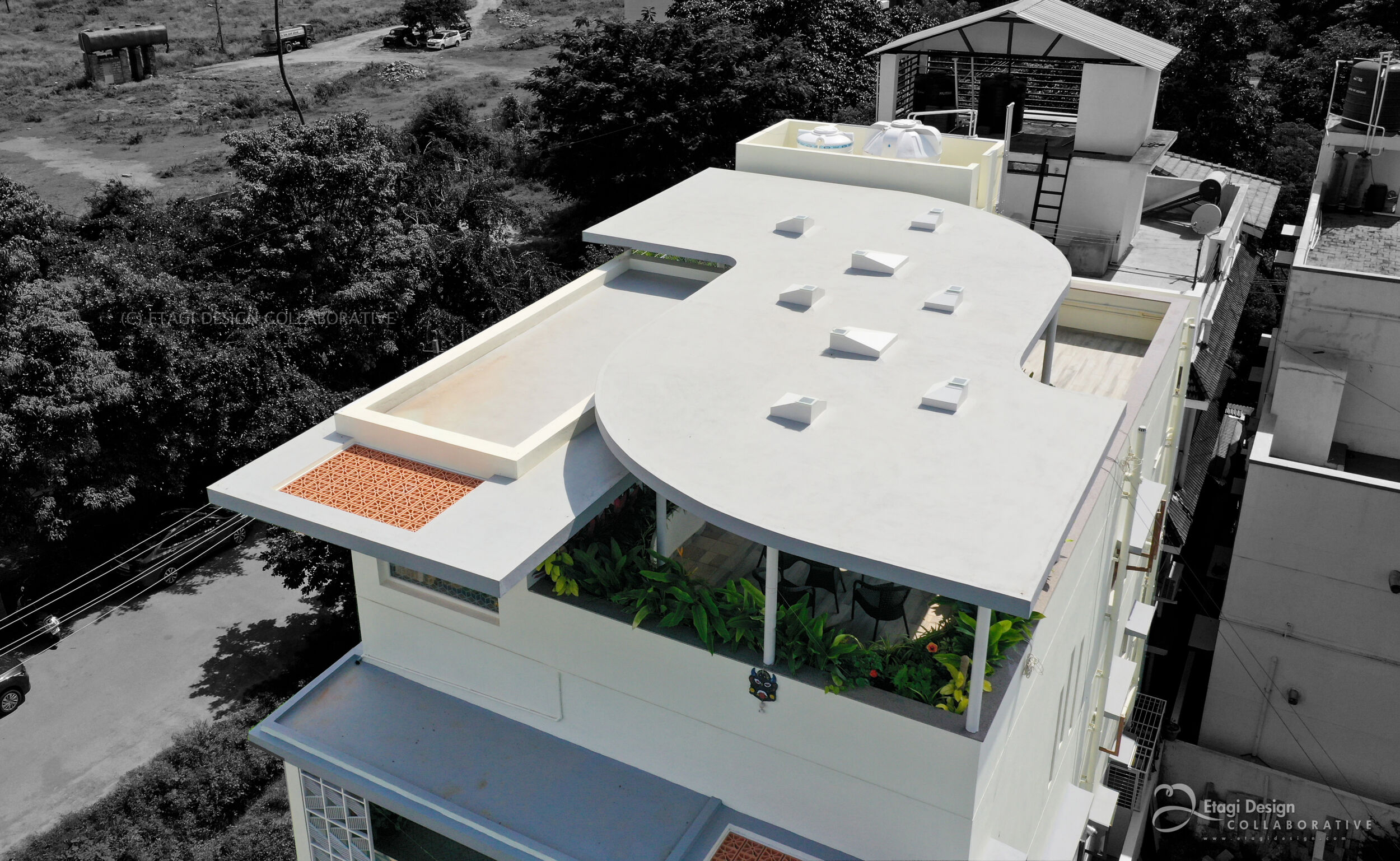 "Madhura," Soumya Murthy and Abhinav Goel's residence in Kanakashree Layout, Bangalore, comprises a 2 BHK rental unit on the ground floor and a 3 BHK duplex for self-occupancy on the upper floors .With a blend of form, color, and materials, the 5000 square foot home is designed to improve family communication. This east-facing 30' x 50' plot has a terrace garden and a contrasting roof, which give it a distinctive touch.