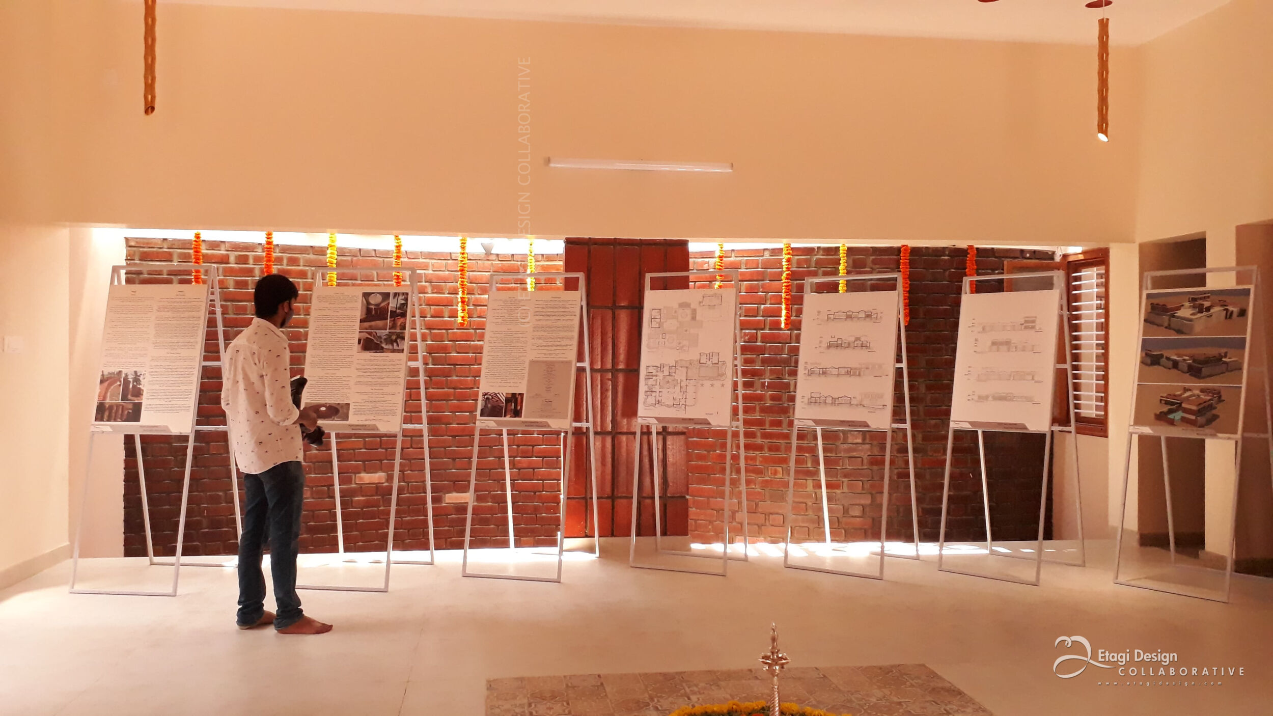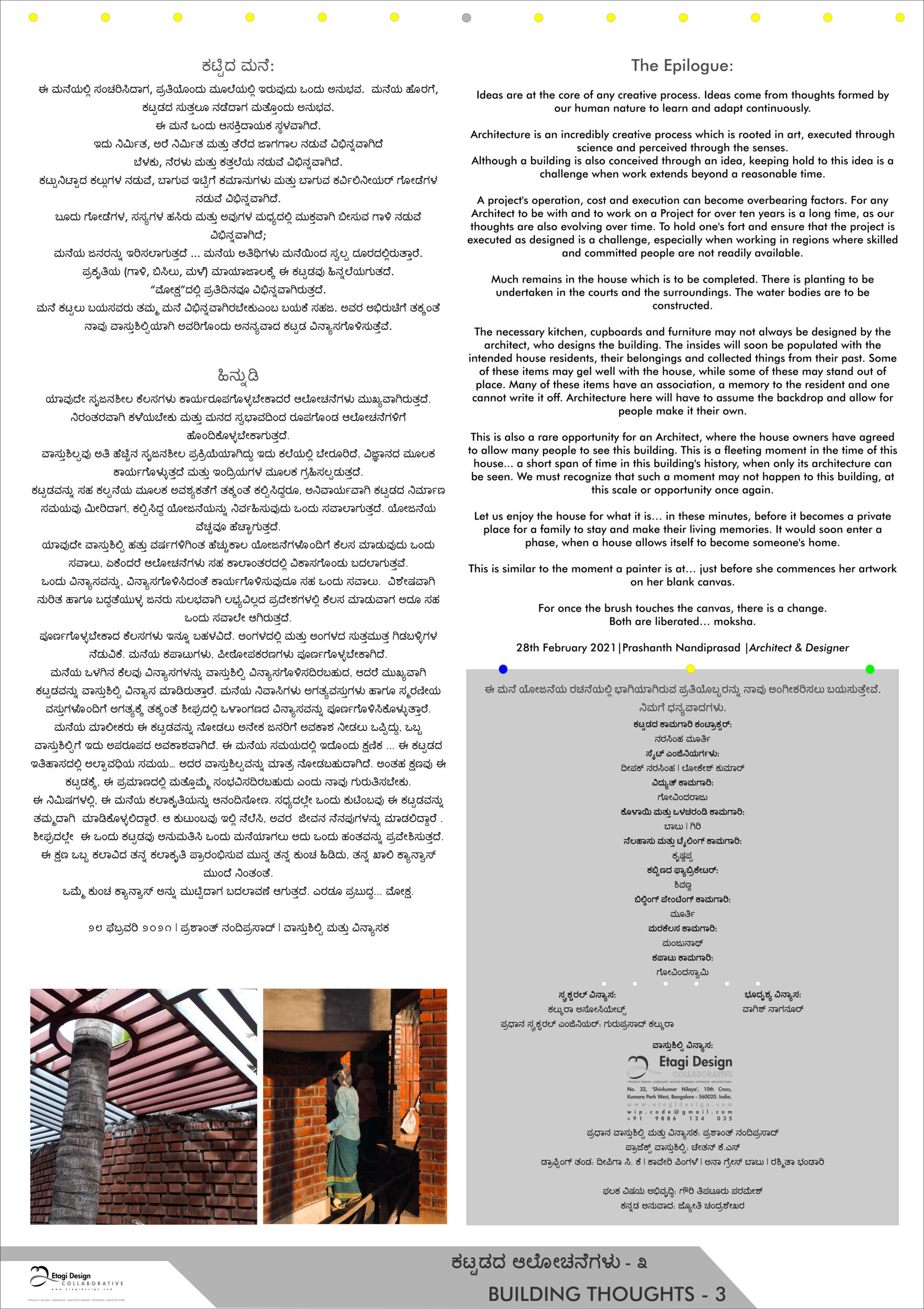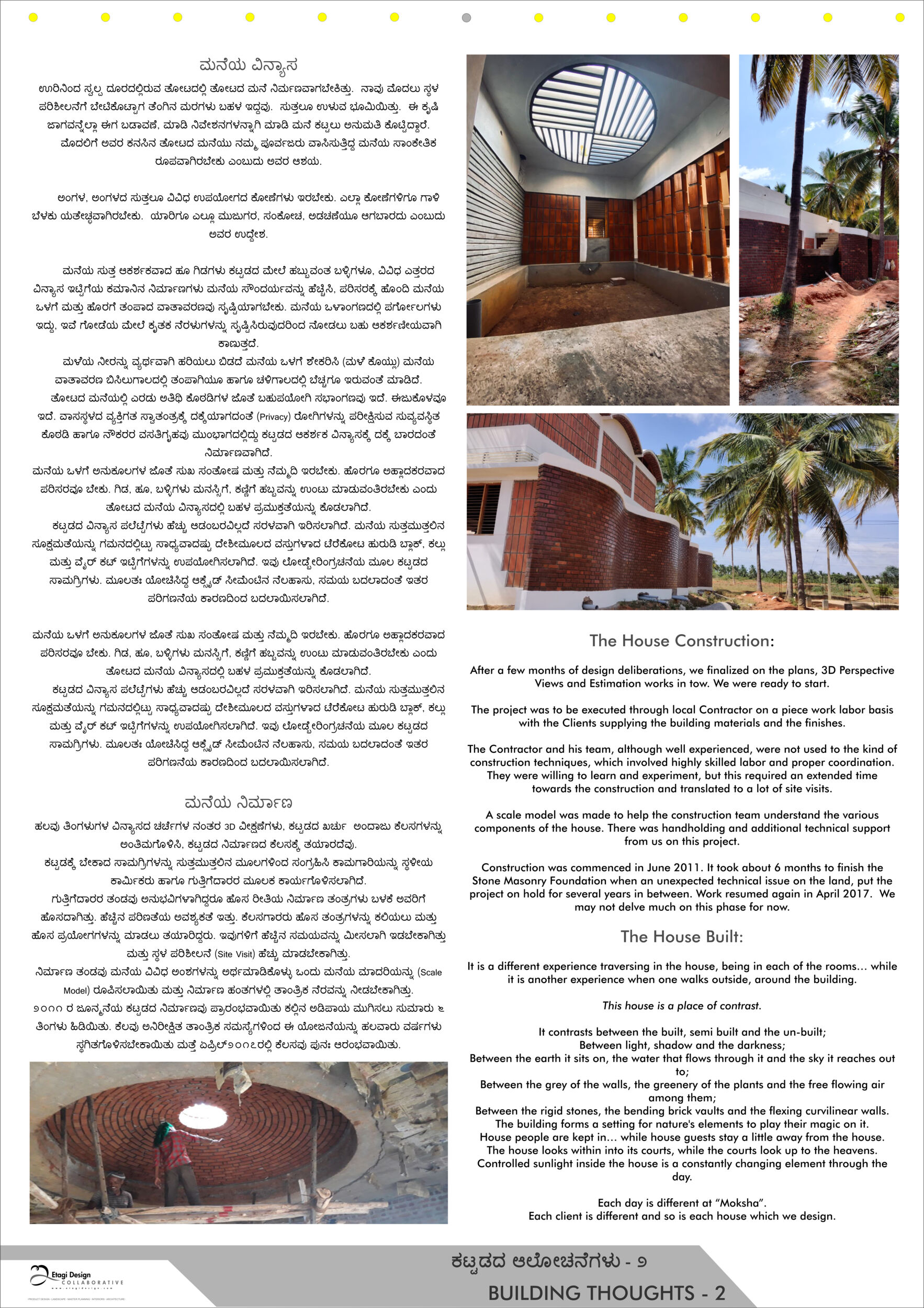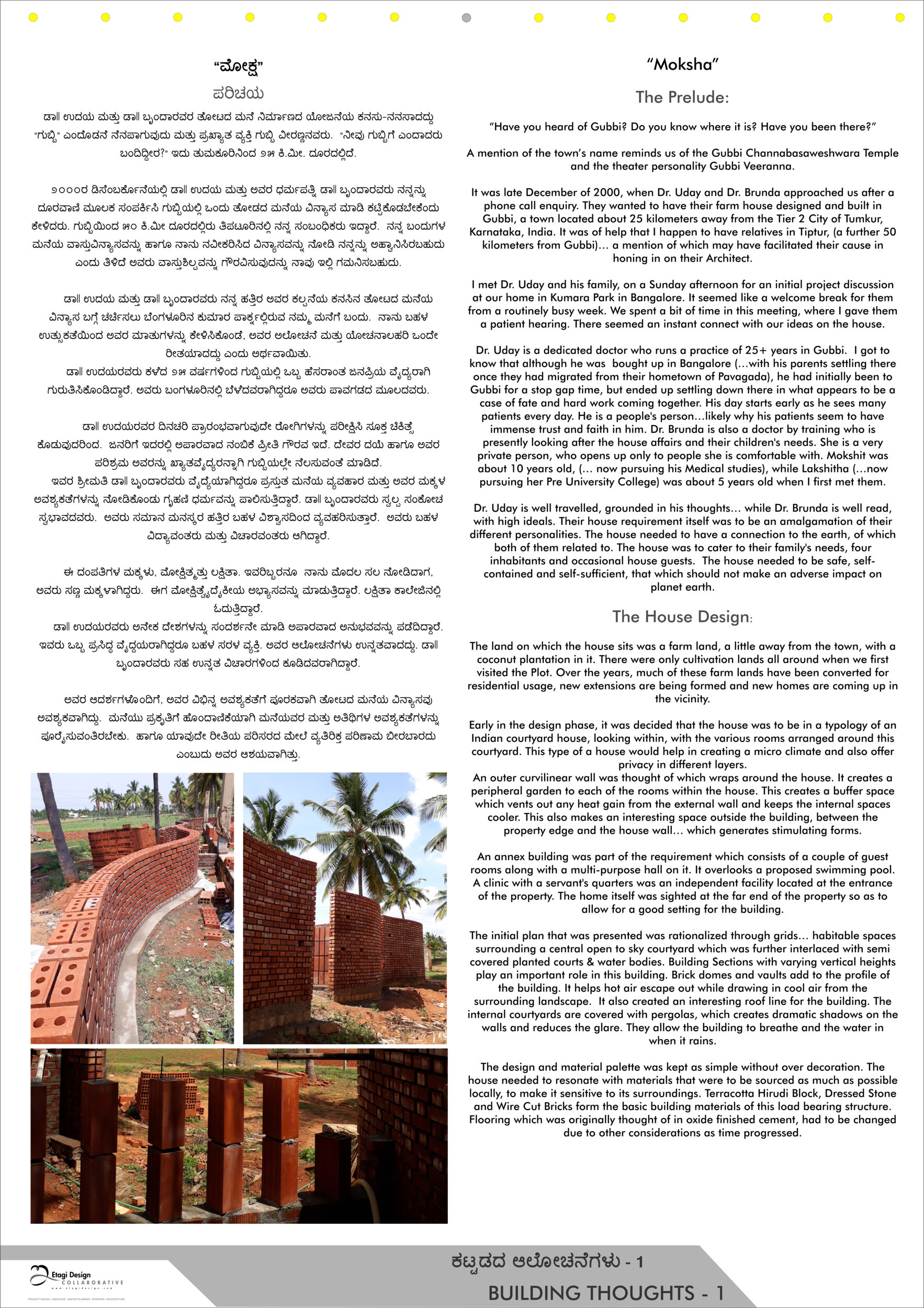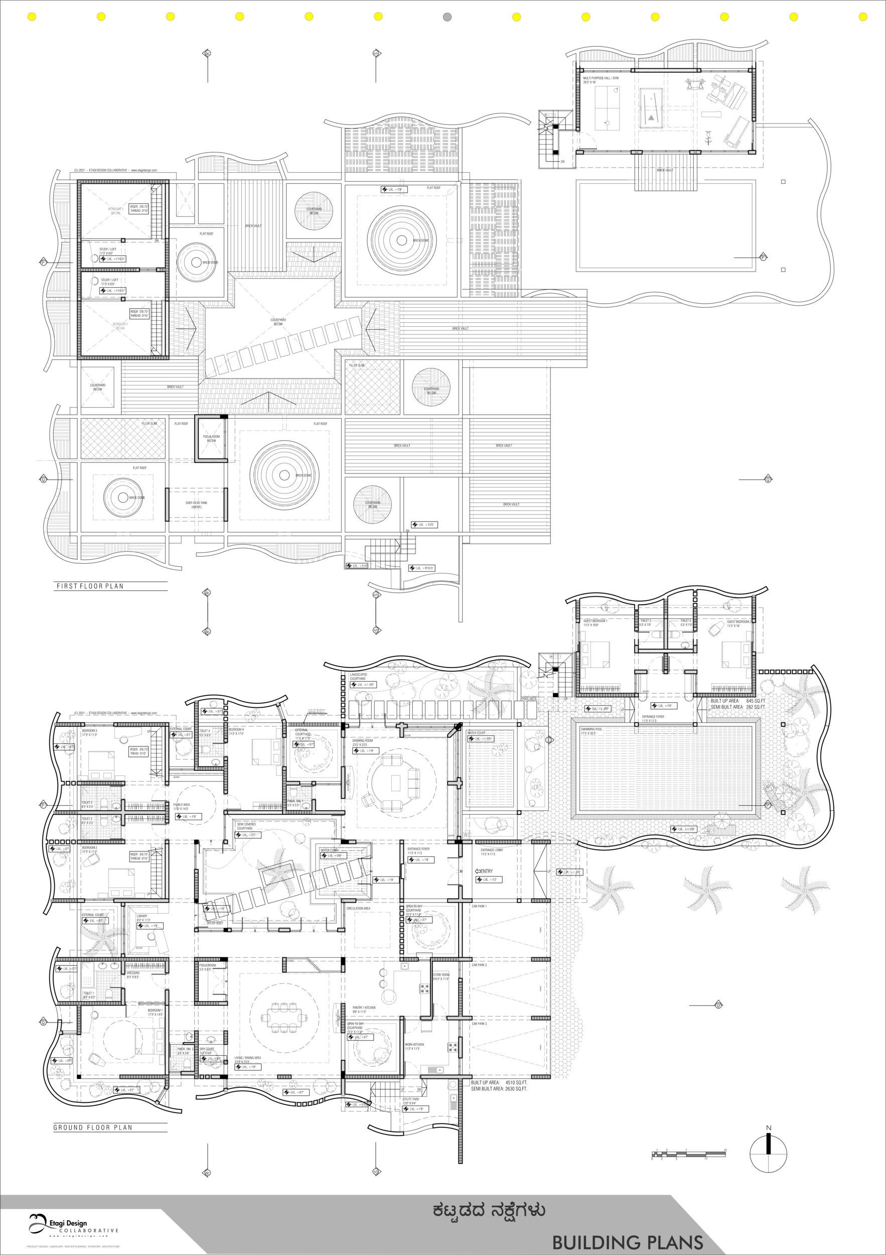 Situated amidst a coconut plantation near Gubbi, approximately 100 kilometers northwest of Bangalore, this expansive 9000 sq. ft., 4+2 bedroom house is uniquely crafted within the typology of an Indian courtyard design. Emphasizing privacy and microclimate control, a curvy-linear outer wall envelops the dwelling, creating peripheral gardens and buffer spaces. An annex building, housing guest rooms and a multi-purpose hall overlooking a proposed swimming pool, complements the main structure. Strategically placed at the far end of the property, the home is surrounded by habitable spaces organized around a central open-to-sky courtyard, interwoven with semi-covered planted courts and water features. Varied vertical heights, brick domes, and vaults contribute to the architectural profile, facilitating airflow and creating an intriguing roofline. Pergola-covered internal courtyards cast dramatic shadows, while the design embraces simplicity and local materials, featuring Terracotta (Hurudi) Blocks, Dressed Stone, and Wire Cut Bricks, embodying sensitivity to the rural surroundings.