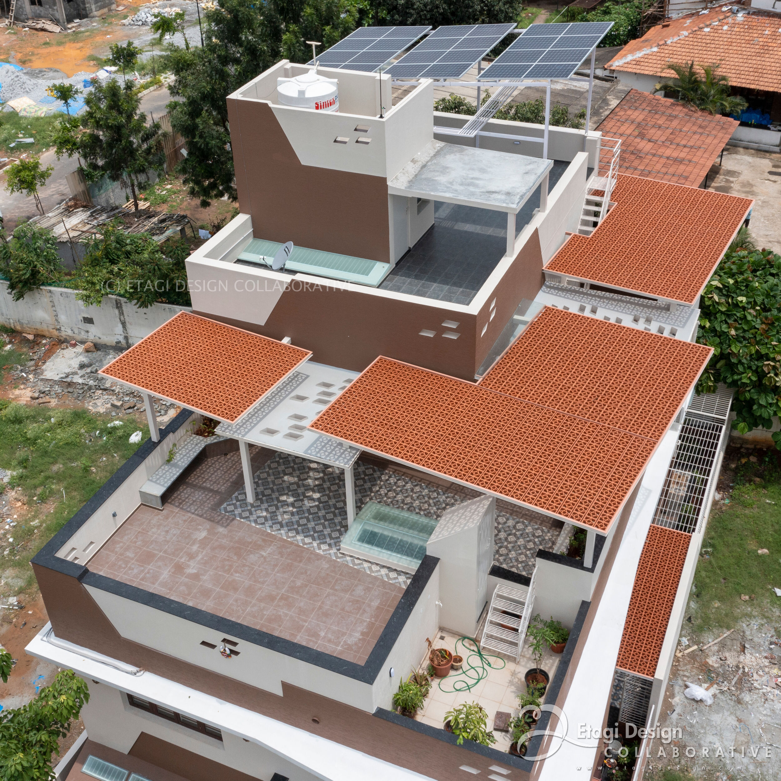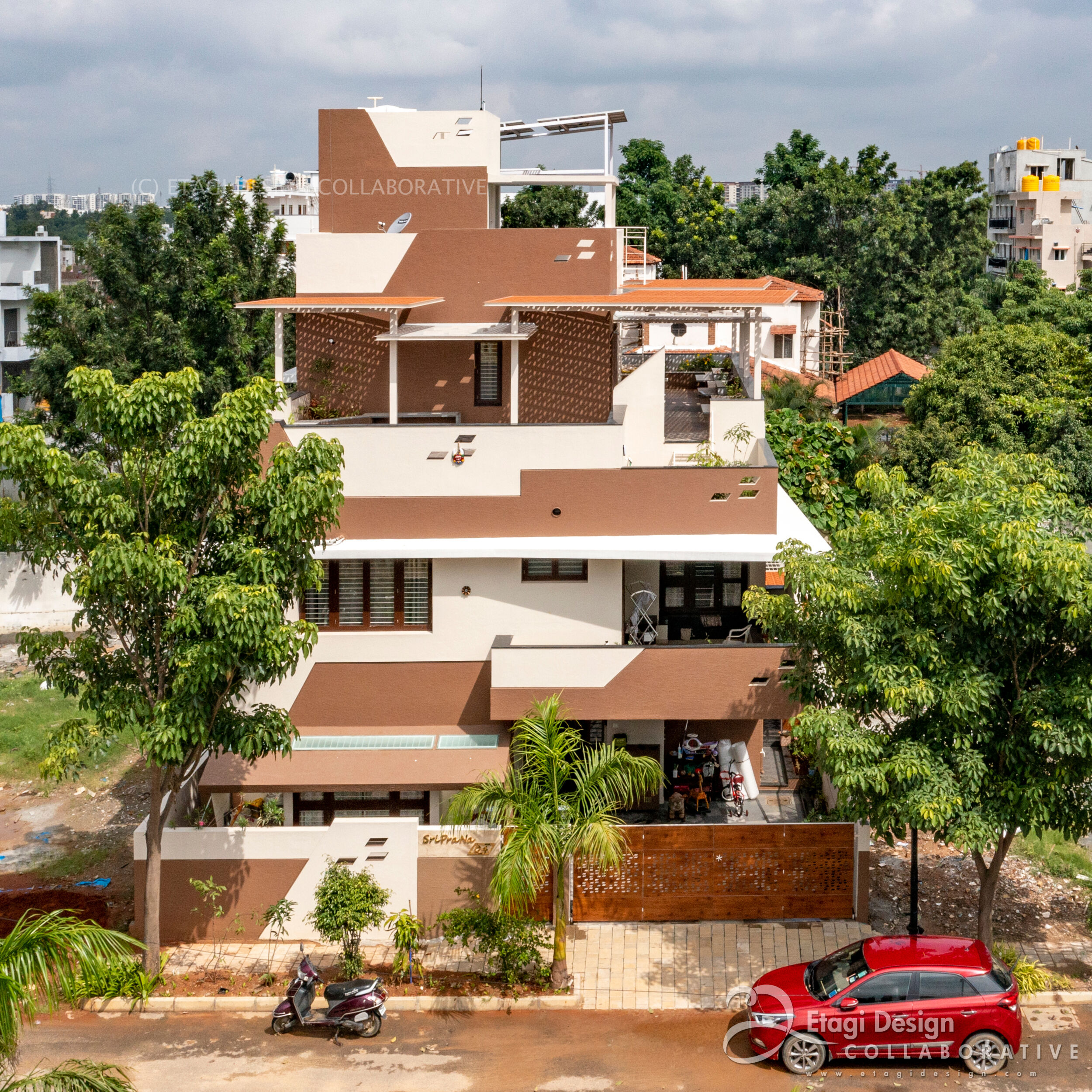 Srivathsan & Shobhana's elegant residence stands proudly on a 12M X 18M (40' x 60') east-facing plot in the scenic "Odion - Woods of the East Layout" in Doddakenelli, off Sarjapur Road, Bangalore. Spanning three floors and encompassing 4500 sq. ft., this meticulously designed home features 4 bedrooms, a hall, kitchen, and a dedicated home office, reflecting a perfect blend of spacious living and functional workspace.